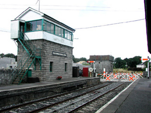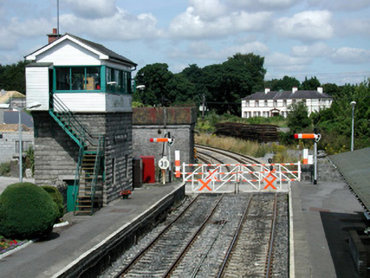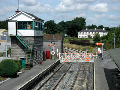 Detached two-bay two-storey signal box, built c.1860 built by the Great Southern Railway. Pitched slate roof with red brick chimneystack. Coursed rock-faced walls with dressed cornice to ground floor and timber panelling to first floor. Replacement windows and doors. Steel steps to first floor. Timber sign bears name of station. Cast-iron signal post to east and west platforms, to north of signal box. Timber level crossing gates to concrete piers with cast-iron lamps. Freestanding water tower to north-west with coursed limestone walls and eaves course with cast-iron water tank and cast-iron measure. Round-headed window with raised block-and-start surround. Building now disused.