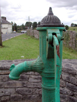 This water pump, surrounded on three sides by a curving stone wall, is an important piece of street furniture within Mount Talbot. The pump was once an integral part of the community's historic fabric, being a communal water source for those in the locality. Today the pump continues to be an attractive object with its fluted detailing and cow tail style handle.