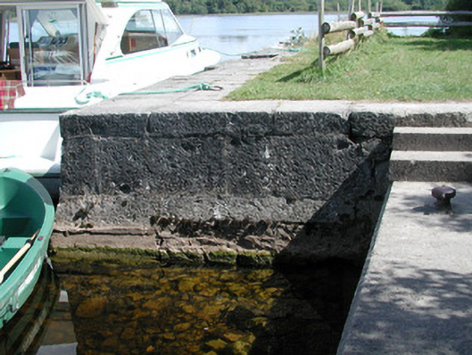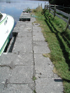 Mooring quay, built c.1810, comprising cut limestone quay with inset steps leading down to lake. Wrought-iron mooring rings to quay. Quay is abutted to west by concrete quay and jetties linking it to a landing place.