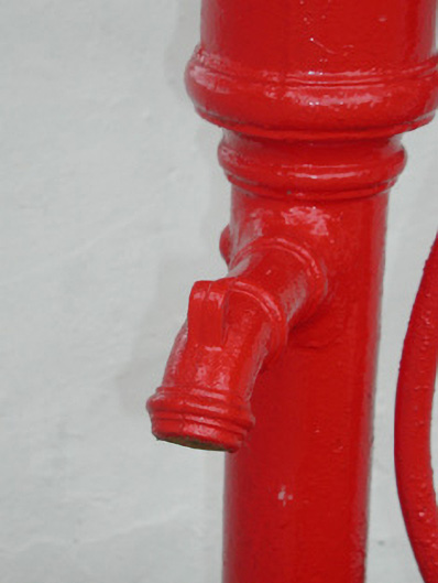 This water pump exhibits artistic detailing with an elegantly curved handle, banded shaft, fluted cap and finial. It remains an important source of water for the area.