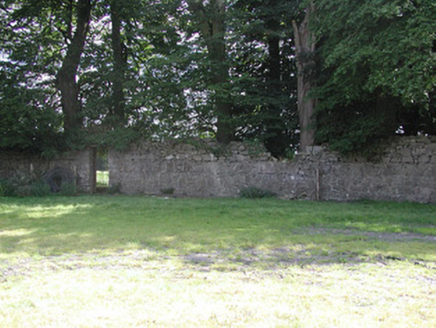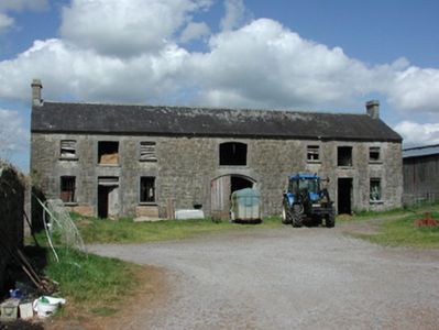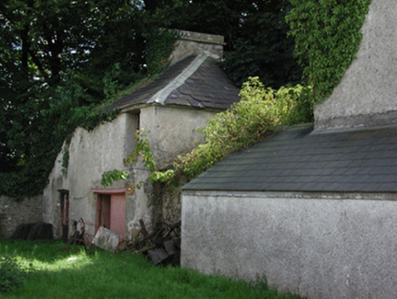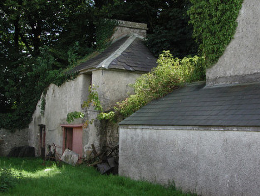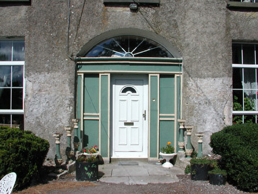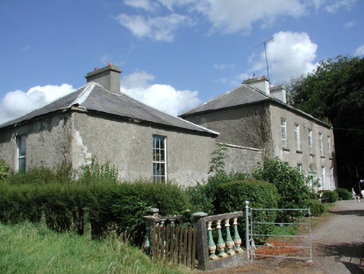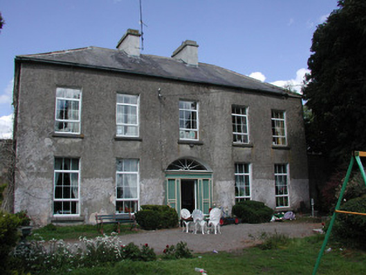Detached five-bay two-storey house, built c.1750, with attic storey. Flanking pavilions linked to house by screen walls and single-storey lean-to extensions to rear. Hipped slate roof with terracotta ridge tiles and rendered chimneystacks. Roughcast-rendered walls. Square-headed window openings with tooled limestone sills and replacement uPVC windows. Round-headed stair window to rear elevation. Dormer windows to attic. Round-headed doorway flanked by stone panels and blocked-up sidelights, with replacement uPVC door and fanlight, approached by limestone flags. Two-storey coach house to rear yard with pitched slate roof, ashlar chimneystacks and random coursed stone walls. Tooled limestone surrounds to central carriage arch opening and window and door openings. Remains of walled garden to east of rear yard.