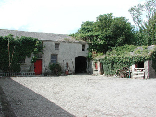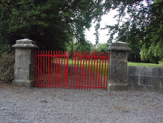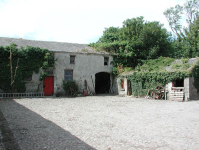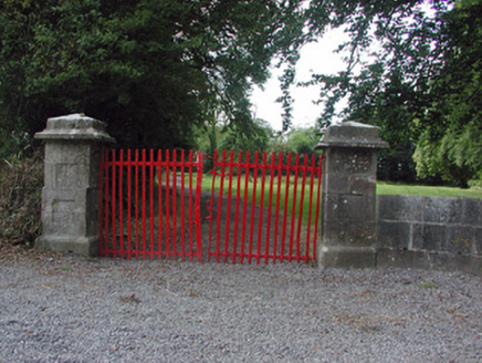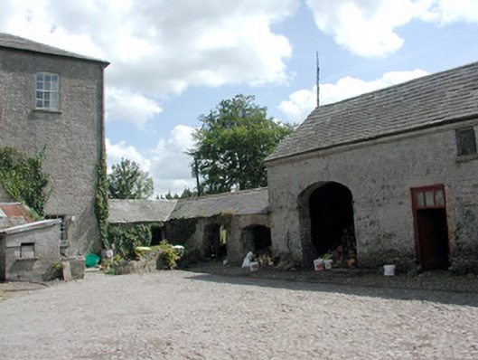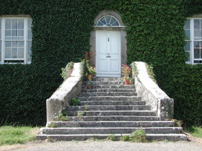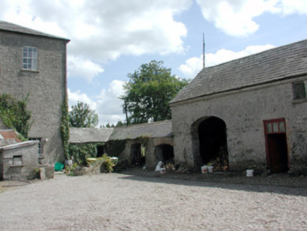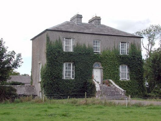 Detached three-bay two-storey former country house over basement, built c.1770, with single-storey lean-to extension to rear. Hipped slate roof with stone chimneystacks and limestone eaves course. Roughcast-rendered walls. Square-headed window openings with tooled stone sills and tripartite timber sliding sash windows. Blind windows to side elevations. Round-headed doorway with limestone surround, timber panelled door and spoked fanlight, accessed by sweeping limestone steps. L-plan outbuildings to cobbled enclosed yard to rear, with pitched slate roofs and roughcast rendered walls. Many interior features survive, such as plaster cornices to main reception rooms, and flags to basement floor. Limestone gates piers to front of site with simple wrought-iron gate.
