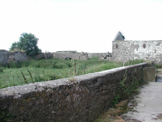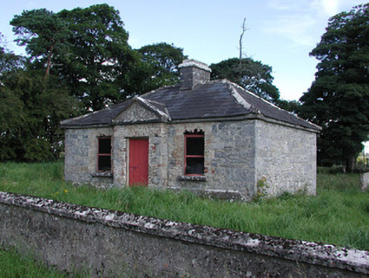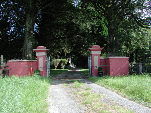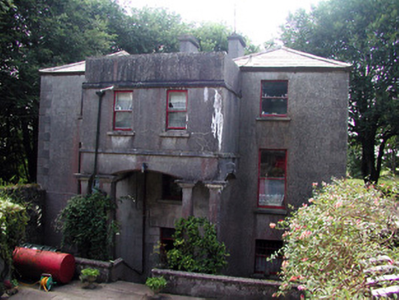 Detached three-bay two-storey over basement house, built c.1770, with improvements including first floor projection to rear supported on concrete columns and entrance porch to front elevation, added c.1860. U-plan hipped slate roof with rendered chimneystacks and cast-iron rainwater goods. Rendered walls with stucco quoins. Square-headed window openings with timber sash windows and stone sills. Rusticated entrance porch with stucco dentil cornice and castellated parapet contains a segmental-headed door opening with plain overlight and timber panelled door with stained glass panels. Outbuilding to enclosed rear yard with central carriage arch opening. Single-storey three-bay gate lodge with pedimented entrance porch to roadside with rendered gate piers. Multiple-bay two-storey derelict outbuildings to west of house.