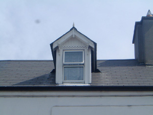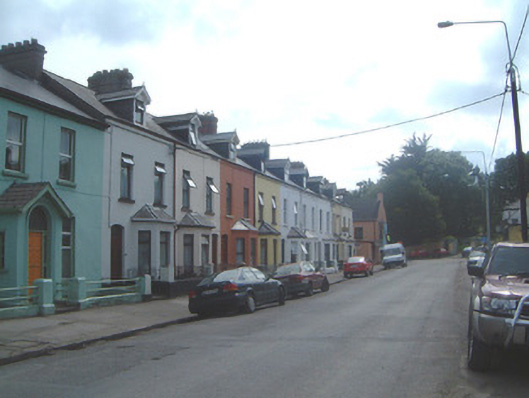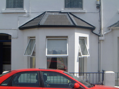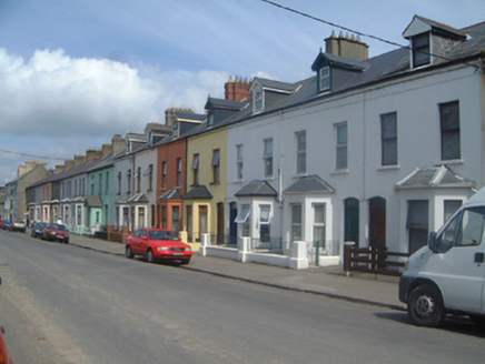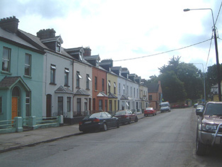 Terraced two-bay two-storey rendered house with dormer attic, built c. 1890, with projecting single-storey canted bay window to ground floor south. One of a group of nine. Pitched artificial slate to main roof and bay window roof, painted timber gabled dormer with pinnacled barge-boards carried on carved corbel brackets and decorative vertical sheeting to tympanum, unpainted smooth-rendered chimneystack, lead hips to bay, cast-iron rainwater goods. Painted smooth-rendered ruled-and-lined walls. Square-headed window openings, painted stone sills, uPVC casements c.1990. Segmental-headed door opening, plain-glazed overlight, painted timber four-panel door. Set back slightly from street with small garden area to front bounded by mild steel railings on rendered and painted plinth wall.