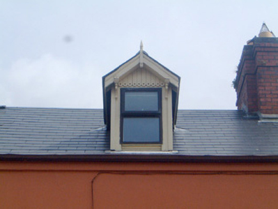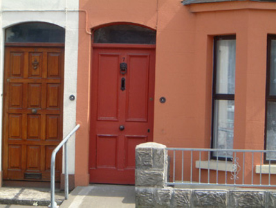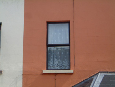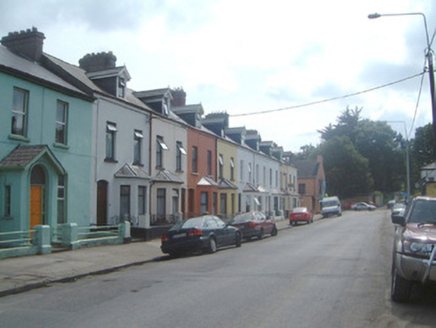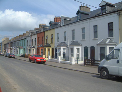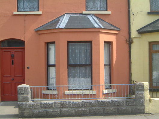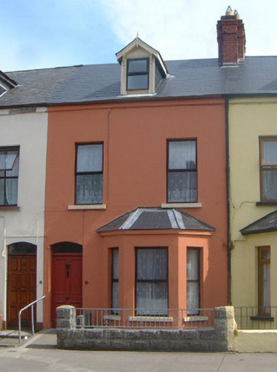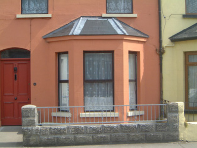 Terraced two-bay two-storey rendered house with dormer attic, built c. 1890, with projecting single-storey canted bay window to ground floor south. One of a group of nine. Pitched artificial slate roof, painted timber gabled dormer with pinnacled barge-boards carried on carved corbel brackets and decorative vertical sheeting to tympanum, red brick corbelled chimneystack, cast-iron rainwater goods. Hipped artificial slate roof to bay, lead hips, cast-iron rainwater goods. Painted smooth-rendered ruled-and-lined walls. Square-headed window openings, painted stone sills, uPVC casements c.1990. Segmental-headed door opening, plain-glazed overlight, painted timber four-panel door. Set back slightly from street with small garden area to front bounded by mild steel railings on concrete block plinth wall.