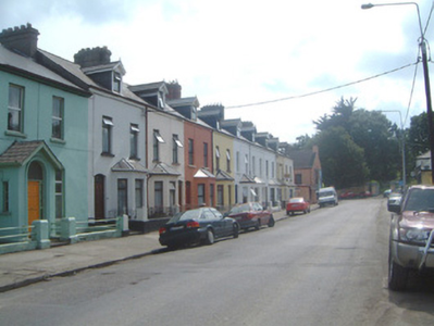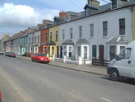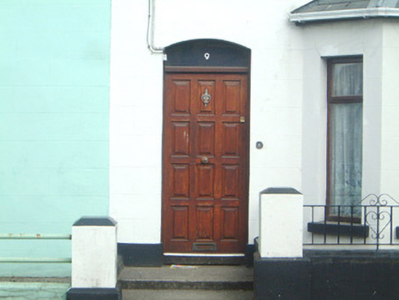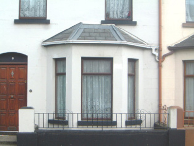 Terraced two-bay two-storey rendered house with dormer attic, built c. 1890, with projecting single-storey canted bay window to ground floor south. One of a group of nine. Pitched artificial slate to main roof and bay window roof, painted timber gabled dormer with pinnacled barge-boards carried on carved corbel brackets and decorative vertical sheeting to tympanum, unpainted smooth-rendered chimneystack, lead hips to bay, cast-iron rainwater goods. Painted smooth-rendered ruled-and-lined walls. Square-headed window openings, painted stone sills, hardwood casements c. 1980. Segmental-headed door opening, plain-glazed overlight, hardwood twelve-panel door c. 1980. Set back slightly from street with small garden area to front bounded by mild steel railings on rendered and painted plinth wall.