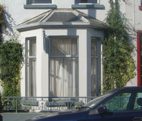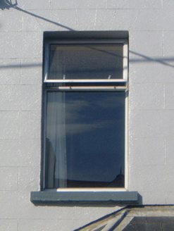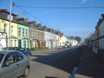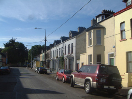 Terraced three-bay two-storey rendered house with gable-fronted dormer attic, c. 1890, with projecting single-storey canted bay window to ground floor north. Also in use as guest house. One of a group of seven. Pitched artificial slate roof, clay ridge tiles, unpainted smooth-rendered corbelled chimneystack, painted timber dormer window with decorative barges on bracketed corbels and scalloped vertical sheeting to tympanum, lead hips to bay, extruded aluminium moulded gutters on painted timber fascia, cast-iron downpipe. Painted smooth-rendered ruled-and-lined walls. Square-headed window openings, painted stone sills, aluminium casement windows. Square-headed entrance door opening, patterned-glazed overlight, glazed aluminium door. Set back slightly from street with small garden area to front bounded by cast-iron flat-pattern railings on painted smooth-rendered plinth wall.