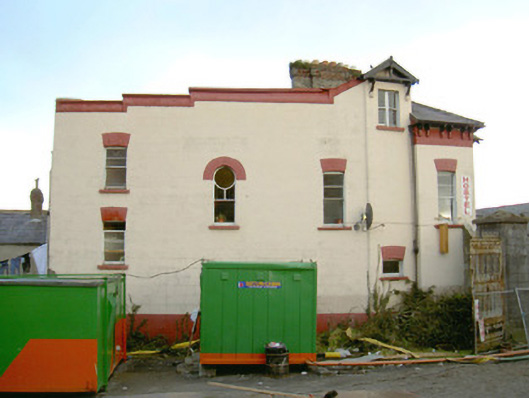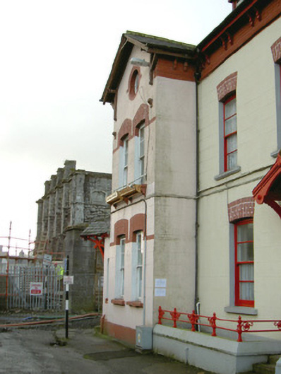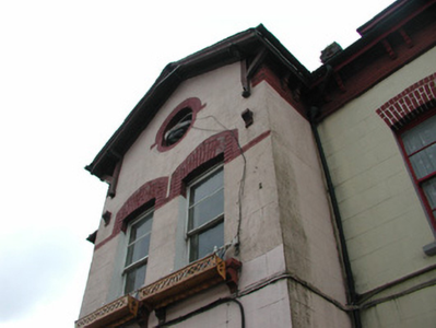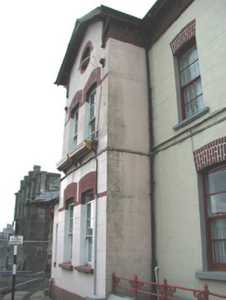 End-of-terrace multi-bay two-storey with attic smooth-rendered house, built c. 1860. Gable-fronted projecting full-height bay to front (east) elevation, splayed corner to south containing canopied entrance. One of a group of four. Pitched slate roof, clay ridge tiles, red brick corbelled chimneystack, painted timber projecting barge boards carried on timber brackets to bay, cast-iron half-round gutters on painted timber projecting eaves fascia on paired timber corbels. Painted ruled-and-lined smooth-rendered walls on moulded plinth. Oculus window to attic with painted brick head, painted stone sill, painted timber horizontally-pivoted casement window. Segmental-headed window openings to ground and first floors, painted brick dressings to first floor, painted stone sills, painted timber two-over-two sash windows to first floor and two-over-one to ground floor. Narrow round-headed window opening between entrance and projecting bay, flush splayed sill, painted timber one-over-one sash window. Segmental-headed door opening with chamfered reveals, painted timber six-panel door, plain-glazed fanlight, decorative painted timber gabled bracketted canopy with slate roof. Two stone steps to street, cast-iron boot scraper to second step. House set back slightly from street. Dressed limestone gate posts adjoin to south.