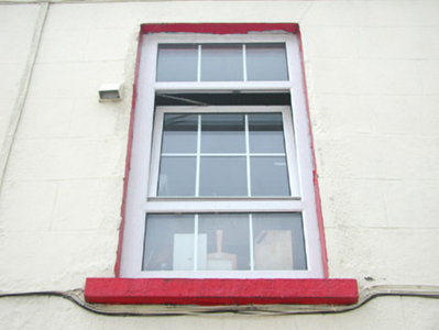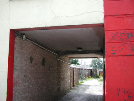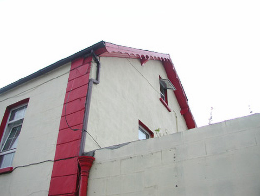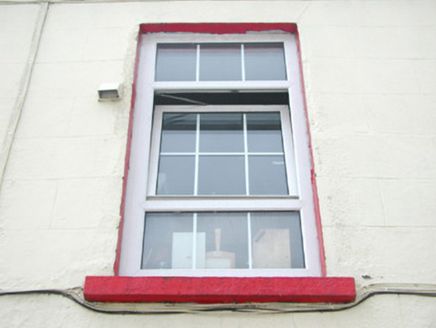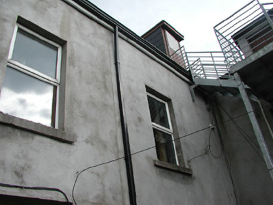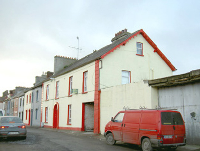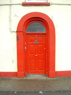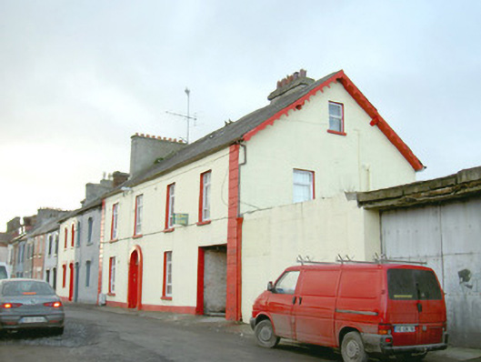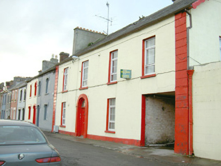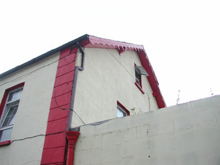 Attached four-bay two-storey rendered house, built c. 1840, with integral carriage arch to north and extensions to rear (west) c. 1890 and c. 1980. Pitched slate roof, unpainted smooth-rendered chimneystack, painted timber decorative projecting barge boards to north gable, extruded aluminium rainwater goods, cast-iron hopper head. Square-headed window openings, painted stone sills, uPVC casement windows. Round-headed door opening with projecting painted plain surround on plinth blocks, painted timber six-panel door, plain-glazed fanlight c.1990. Square-headed carriage opening gives access to rear yard. Slightly set back from street.