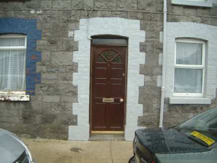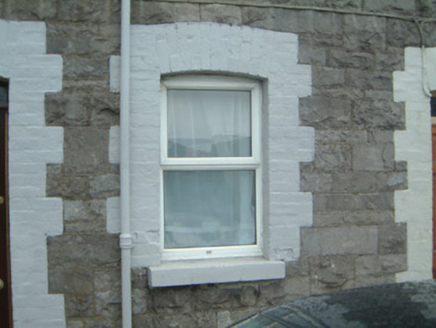 Terraced two-bay two-storey stone house, built c. 1880. Single-storey return to rear. One of a group of six. Pitched slate roof, clay ridge tiles, brick corbelled chimneystack, roof light c. 1995, extruded aluminium gutters, cast-iron downpipe. Squared and coursed rockfaced limestone walling to west elevation. Segmental-headed window openings, painted block-and-start brick surrounds, painted stone sills, uPVC casements c. 2000. Segmental-headed door opening, painted brick dressings, narrow plain-glazed fanlight, hardwood panelled door with integral fanlight c. 2000. Street fronted.