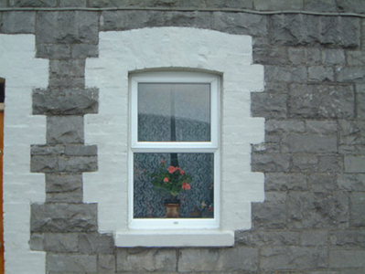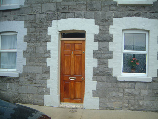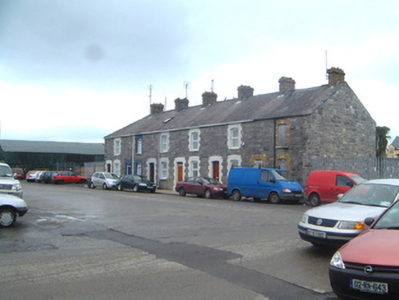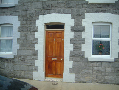 Terraced two-bay two-storey stone house, built c.1880. Single-storey return to rear. One of a group of six. Pitched slate roof, clay ridge tiles, brick corbelled chimneystack, extruded aluminium rainwater goods. Squared and coursed rockfaced limestone walling. Segmental-headed window openings, painted block-and-start brick surrounds, painted stone sills, uPVC casements c. 2000. Segmental-headed door opening, painted brick dressings, narrow plain-glazed fanlight, hardwood six-panel door c. 2000. Street fronted.