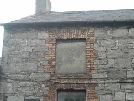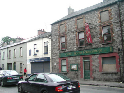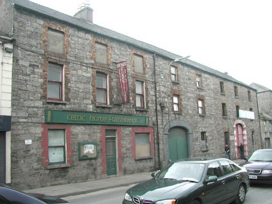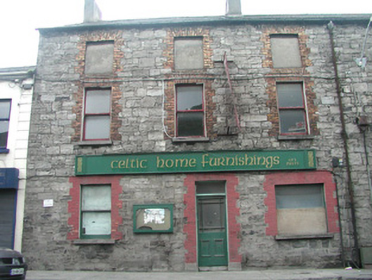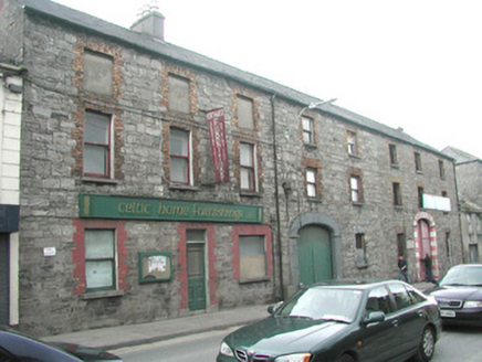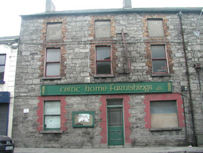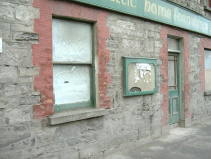 End-of-terrace three-bay two-storey former warehouse which later functioned as a shop, built c. 1870. No longer in use. Pitched slate roof, unpainted smooth-rendered chimneystack, cast-iron rainwater goods. Uncoursed squared rubble limestone walling. Square-headed window openings, brick block-and-start jambs and arches, painted to ground floor, stone sills, painted timber one-over-one sash windows, openings to second floor blocked-up. Square-headed display window to north, painted brick surround. Square-headed door opening to north of centre, painted block-and-start surround, plain-glazed overlight, painted timber half-glazed panelled door. Painted timber fascia sign with moulded edges. Street fronted.