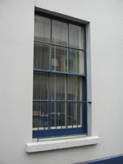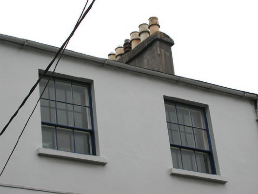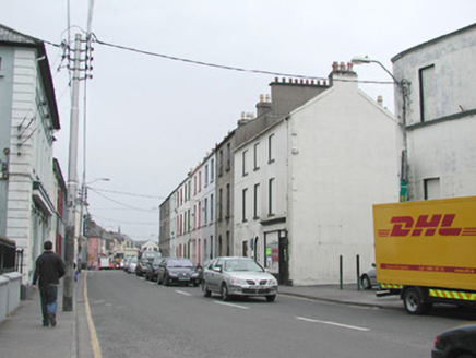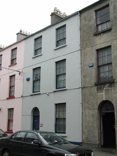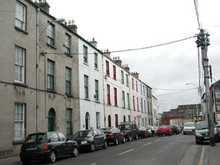Terraced two-bay three-storey smooth-rendered house, built c.1830 as one of a group of eight. Pitched slate roof, unpainted rendered chimneystack with yellow terracotta chimney pots, cast-iron rainwater goods. Painted rendered ruled-and-lined walls on painted stone plinth to base. Square-headed window openings, painted stone sills, six-over-six painted timber sash windows to ground and first floors, six-over-three to second floor. Wrought-iron window guard to ground floor window. Semi-circular-headed door opening, painted timber panelled double doors with plain glazed fanlight over. Single stone threshold step. Street fronted.
