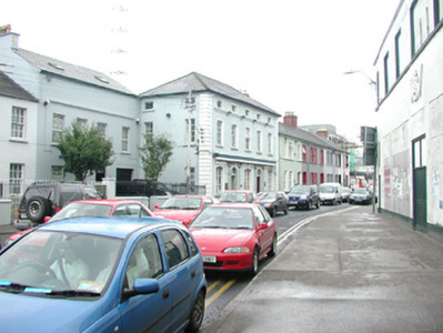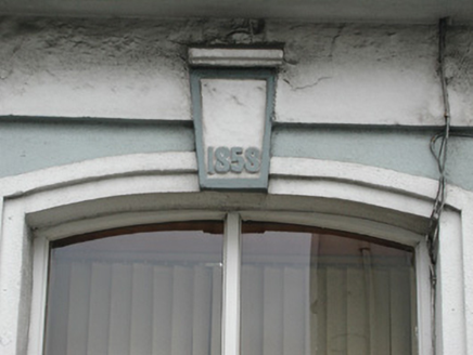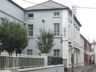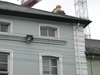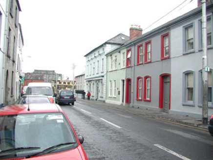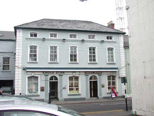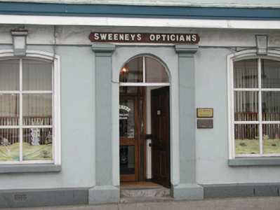 Attached five-bay two-storey rendered commercial property with attic, built 1858. East side aligns with neighbouring terrace while west side has exposed gable returning two bays to abut adjoining building. Hipped artificial slate roof, plain artificial ridge tiles, painted timber fascia, half-round uPVC gutters, square uPVC downpipes, c. 1995. Painted rendered walls, straight banded quoins, painted stone plinth. Segmental-headed window openings, continuous moulded sill to second floor, painted timber casement windows to south elevation c. 1995, four-over-four painted timber sash windows to west elevation. Windows to south elevation with rebated render moulded architraves, keystones to ground floor, one dated 1858. Painted timber shop fascia and cornice over two pairs of painted render pilasters flanking two round-headed doorways each containing six-panel doors, one varnished and one painted c. 1995, with vertically sub-divided fanlights over. Single dressed stone steps to each entrance. Street fronted.