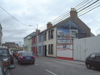 End-of-terrace three-bay two-storey rendered house, built c. 1875. One of a group of four. Pitched artificial slate roof, brick chimneystack, cast-iron rainwater goods on projecting eaves course. Painted, rendered ruled-and-lined walls. Segmental-headed window openings to ground floor and square-headed to first, with painted moulded render architraves, painted stone sills, painted timber one-over-one sash windows. Segmental-headed door opening with painted moulded render architrave, painted timber door with four raised lozenge panels and plain overlight. Two cut limestone threshold steps. Street fronted and adjacent to construction site to east.