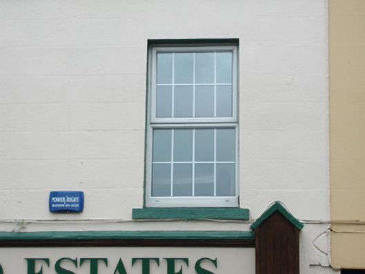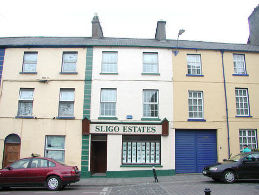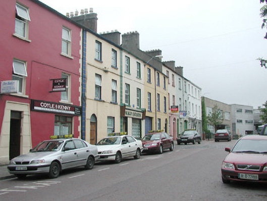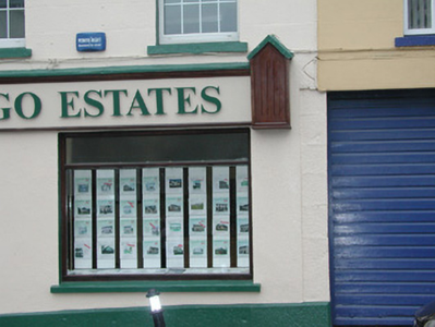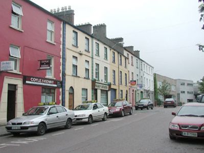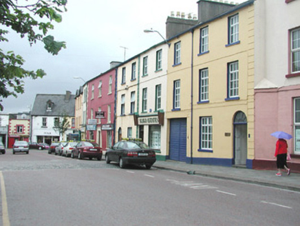 Terraced two-bay three-storey rendered house, built c. 1830. In use as commercial premises. Pitched artificial slate roof, artificial ridge tiles, unpainted smooth rendered chimneystack with yellow clay pots, half-round metal rainwater goods. Painted rendered ruled-and-lined wall, with straight banded quoin to south, on painted stone plinth. Square-headed window openings with painted stone sills, top-hung uPVC casements, c. 2000. Modern shop sign. Square-headed door opening with replacement varnished four-panel timber door, c. 1995. Painted stone step. Street fronted.
