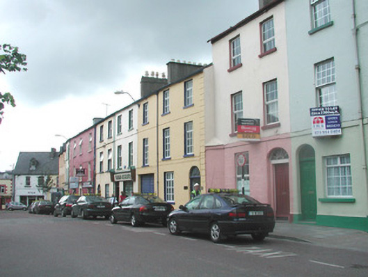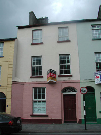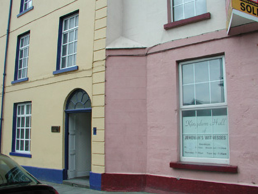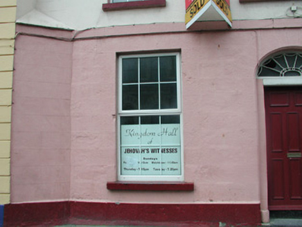 Terraced two-bay three-storey house, built c. 1840. Subsequently in use as Jehovah's Witness Meeting House. Pitched artificial slate roof, c.1970, Velux window, c. 1970, two unpainted rendered chimneystacks forming L-shape, half-round metal gutters. Painted ruled-and-lined smooth rendered walls to upper storeys, painted ashlar stonework to ground floor. Square-headed window openings with painted reveals and painted stone sills, uPVC casement windows, c. 2000. Elliptical-headed door opening with decorative fanlight over replacement painted timber panelled door, c. 1990. Street fronted opposite former town hall. Site is bordered by a chamfered corner at break forward to south.