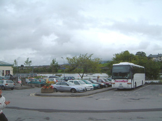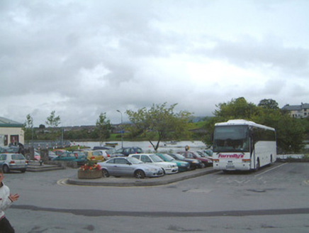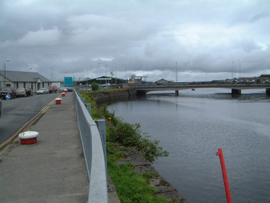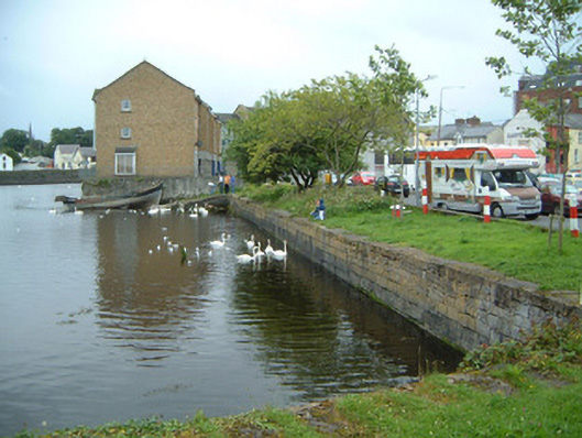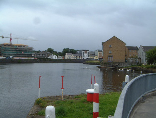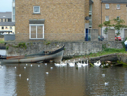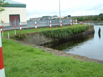 C-plan limestone harbour wall, built c. 1830, with slipway to south-east corner and returning squared limestone quay walls along river bank to east and west. Roughly-squared and coursed limestone walling. Limestone paving to quay surface, now largely grass covered and having variety of painted metal mooring posts. Situated at north of carpark, with Garavogue river to south-east.