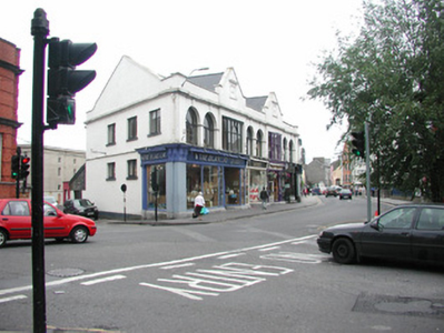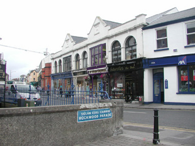 This well composed block of shops is centrally-located at a busy junction. The shopfronts are well designed and enlivened by the recessed doorways. The unusual fenestration pattern at first floor adds variety to the streetscape. Traditional mechanical awnings survive above each shopfront.