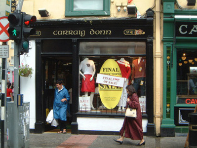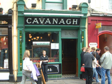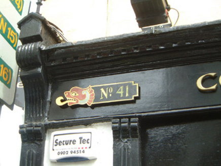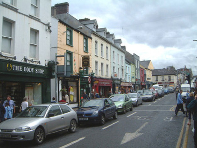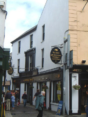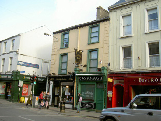 Attached corner-sited pair of single-bay three-storey former house, built c. 1870, now commercial premises. Shopfront, c. 1900 to ground floor north and pub front, c. 1995, possibly retaining some earlier elements, to ground floor south. Pitched slate roof, clay ridge tiles, rendered chimneystack, cast-iron rainwater goods on corbels. Painted rendered walls, straight banded quoins. Square-headed window openings with simple moulded render architraves, painted stone sills, painted timber casements, c. 1980. Shopfront to north with fluted pilasters supporting timber fascia with scrolled brackets and dentilled cornice, square-headed timber frame display window on stall riser. Square-headed door opening with boarded-up overlight and timber and glazed door. Shopfront to south with tiled pilasters and glazed fascia. Street fronted building on main street with narrow lane to north leading down to Garavogue River.