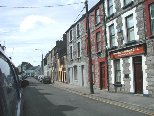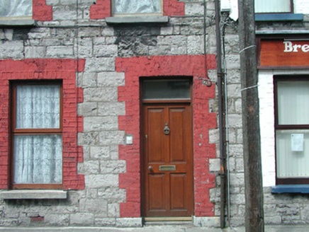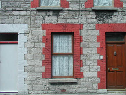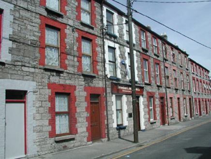 Terraced two-bay three-storey cut limestone house, built c. 1900, with modern flat-roofed extension to rear c. 1990. One of a group of nine. Pitched slate roof, red brick chimneystack c. 2000 with clay pots, clay ridge tiles, brick eaves course, extruded aluminium gutters. Coursed squared limestone masonry walls, painted red brick dressings. Square-headed window openings, stone sills, one-over-one hardwood casement windows. Square-headed door opening, hardwood timber four-panel door c. 1980 with plain overlight above. Street fronted.