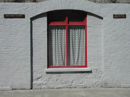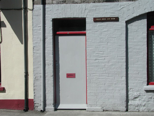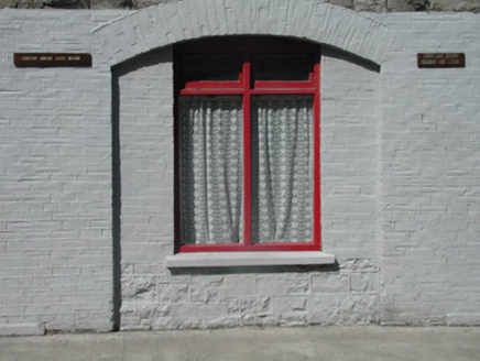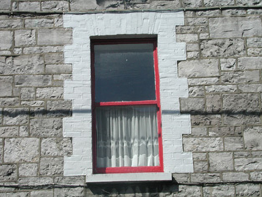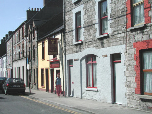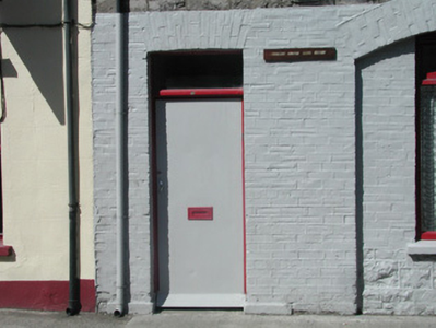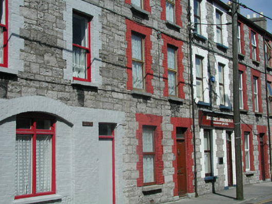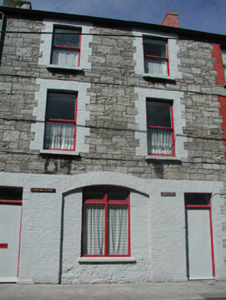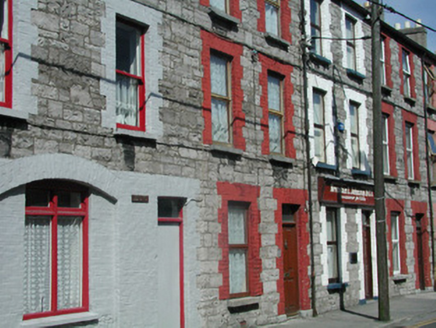 End-of-terrace two-bay three-storey cut limestone house, built c. 1900. Now in use by the Legion of Mary. Integral carriage arch flanked by doorways, blocked-up c. 1950. Modern flat-roofed extension to rear c. 1990. One of a group of nine but wider than remainder of terrace to east. Pitched slate roof, rendered chimneystack with clay pots, clay ridge tiles, brick eaves course, extruded aluminium gutters, uPVC downpipe to west. Coursed squared limestone masonry walls to upper floors with painted red brick dressings, entire ground floor in painted brick. Square-headed window openings, painted stone sills, one-over-one painted timber sash windows to first and second floor, painted timber casement window set in, blocked-up, segmental arch to ground floor. Square-headed door openings, painted flush doors, c. 1990 with plain overlights above. Street fronted.