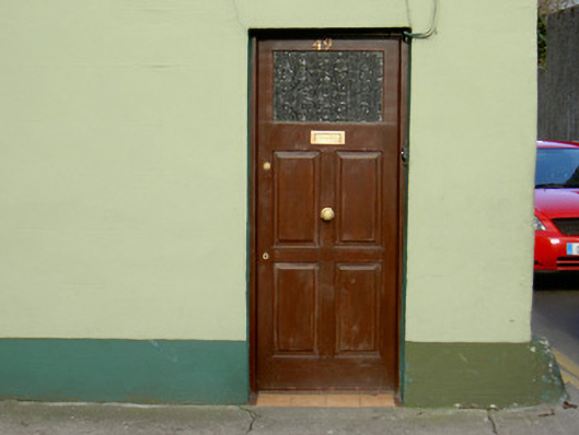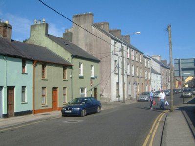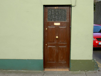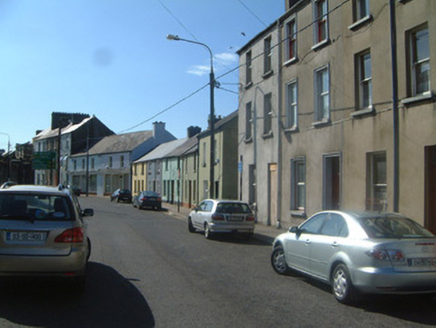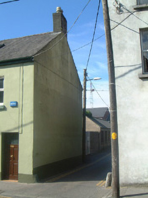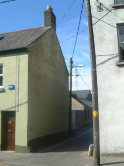 Attached two-bay two-storey rendered house, built c. 1850, with two-storey hipped roof return and enclosed yard to rear. Pitched artificial slate roof c. 1980, attic roof light to north and south slope, clay ridge tiles, rendered chimneystacks with clay pots, cast-iron rainwater goods. Painted smooth-rendered walls. Square-headed window openings, painted stone sills, uPVC casements c. 1990. Square-headed door opening, hardwood five-panel door with glazed top panel c. 1990. Street fronted building with higher ridge line than terrace to west, alleyway to east with conical stone carriage wheel fender on corner.