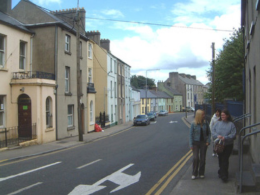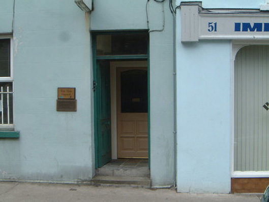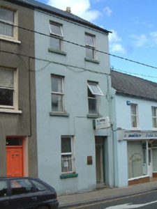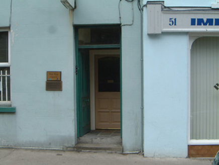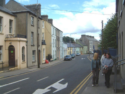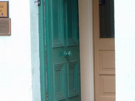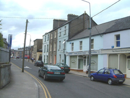End-of-terrace two-bay three-storey rendered house, built c. 1870. One of a group of three. Now in commercial use. Pitched artificial slate roof, unpainted rendered corbelled chimneystack, cast-iron gutters. Painted smooth-rendered ruled-and-lined walling. Square-headed window openings, painted stone sills, uPVC casement windows c. 1990, wrought-iron window guard to ground floor window. Square-headed door opening, painted original timber four-panel door with bolection mouldings, plain overlight, two limestone threshold steps. Street fronted and set back slightly from lower terrace to east.