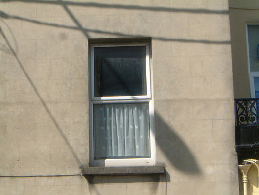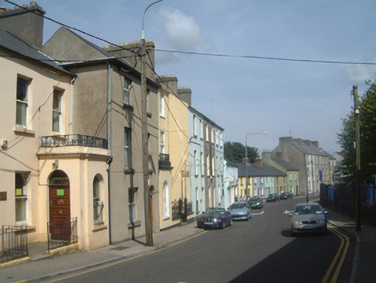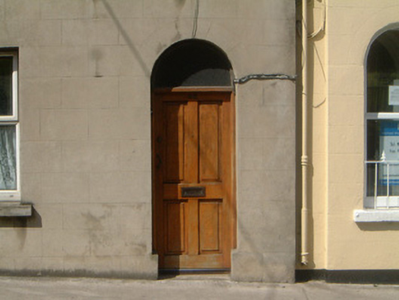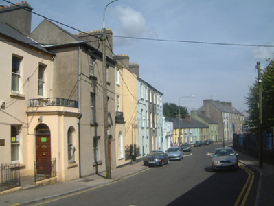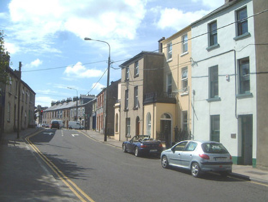 Terraced two-bay three-storey rendered house, built c. 1870. Pitched artificial slate roof, clay ridge tiles, rendered chimneystack, metal rainwater goods. Unpainted smooth ruled-and-lined rendered walls. Square-headed window openings, stone sills, uPVC casements c. 1990. Round-headed door opening, plain-glazed fanlight, hardwood four-panel door c. 1980. Street fronted and flanked on either side by porches belonging to adjacent properties.