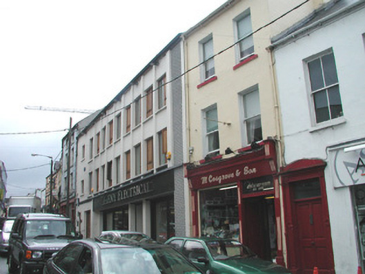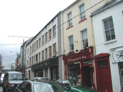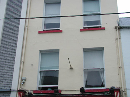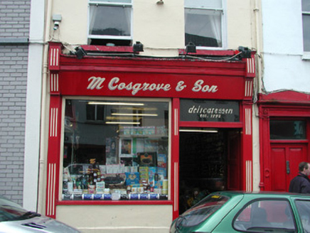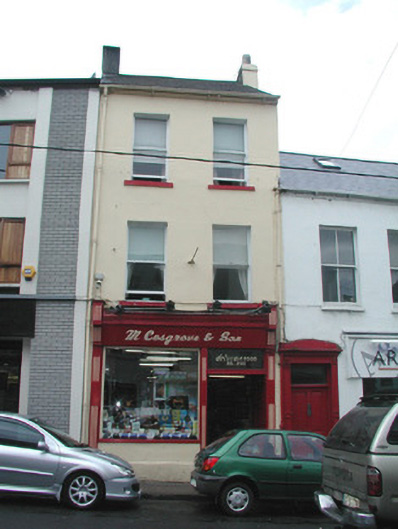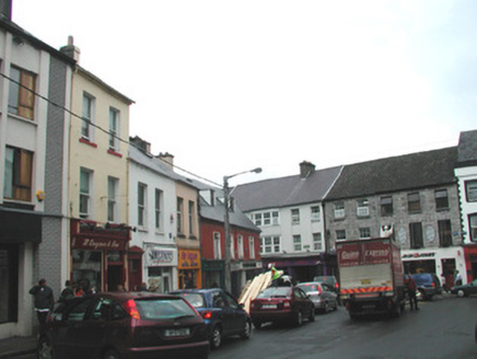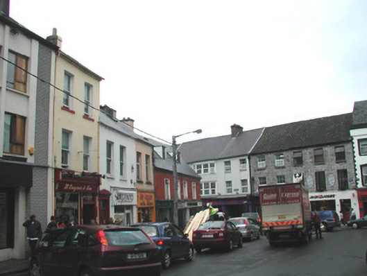 Terraced two-bay three-storey rendered house with shop, built c. 1870. Pitched slate roof, painted smooth-rendered chimneystack, cast-iron gutters on eaves corbel, cast-iron downpipe. Painted ruled-and-lined smooth-rendered walls, above painted smooth-rendered shopfront. Square-headed window openings, painted masonry sills, painted timber one-over-one sash windows to upper floors. Square-headed shopfront, painted fluted pilasters, painted fascia board terminating in fluted consoles. Square-headed door opening to north with overlight above painted timber three-panel double doors, painted timber glazed sliding inner door, encaustic tile threshold panel. Street fronted to inclined street, facing former market place.