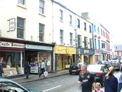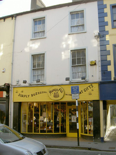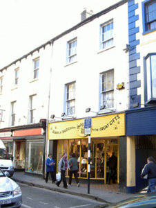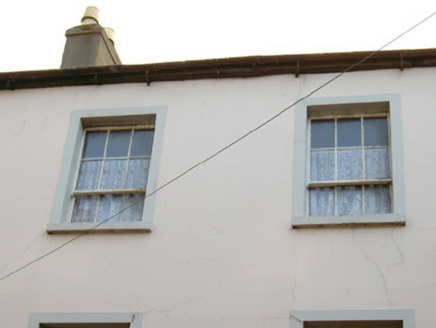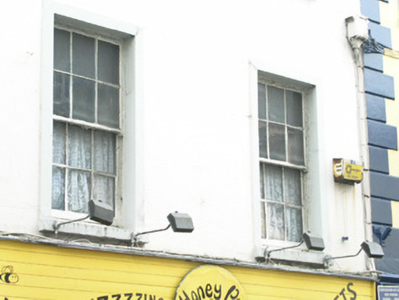 Terraced two-bay three-storey smooth-rendered house, built c. 1840, with shop. Now in commercial use. Pitched slate roof, unpainted smooth render corbelled chimney, clay ridge tiles, cast-iron gutters on drive-in brackets on eaves corbel course. Painted, lined, smooth-rendered walls to upper floors. Square-headed window openings with painted rendered architrave, painted masonry sills, painted timber six-over-six sashes to first floor windows and six-over-three to second floor. Painted timber shop front, c. 1995 with deep timber fascia over multiple-paned display windows and recessed glazed door. Street fronted.