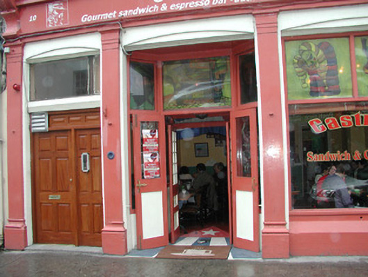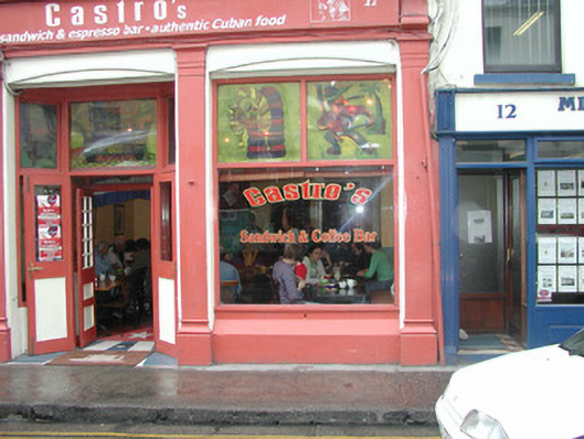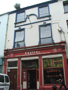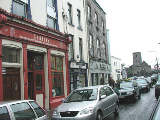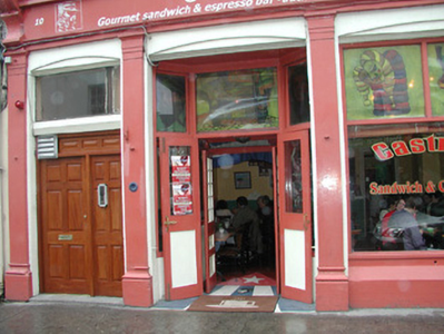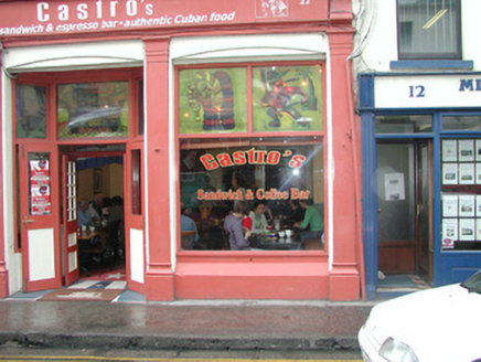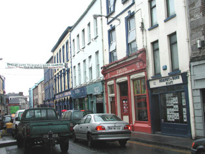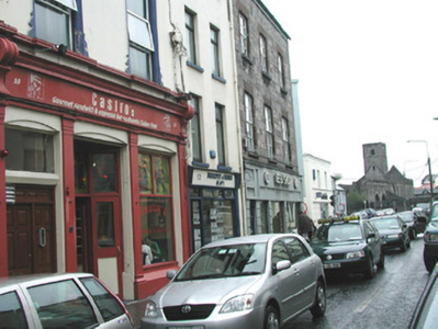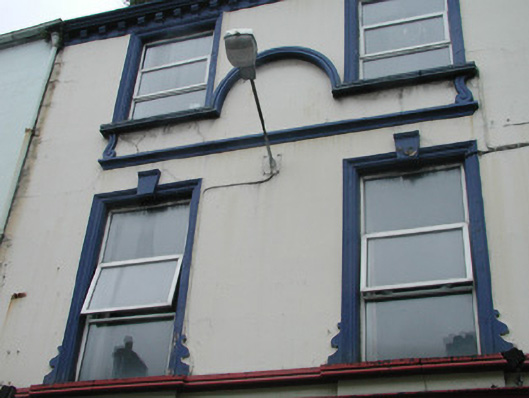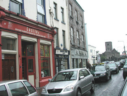 Terraced two-bay three-storey retail premises, built c. 1860, with separate entrance to upper storeys on west. Roof not visible, one yellow brick chimneystack, one rendered chimneystack with yellow clay chimney pots, cast-iron rainwater goods. Painted smooth-rendered walls to upper floors, corbelled eaves, painted pilasters to shopfront. Square-headed window openings to upper floors, painted moulded render surrounds, sill course rising to semi-circle between second floor windows, moulded render keystone and kneed architraves to first floor windows, uPVC casement windows c. 1980. Square-headed window openings to shopfront with Doric pilasters supporting fascia board terminating in consoles, painted timber segmental-headed glazed shop window, recessed segmental-headed door opening with painted timber and glazed double doors. Square-headed door opening to west with overlight above hardwood panelled doors c. 2000. Street fronted.