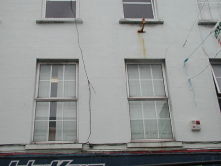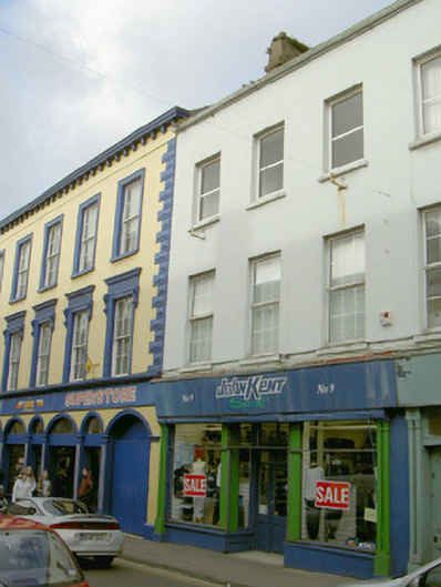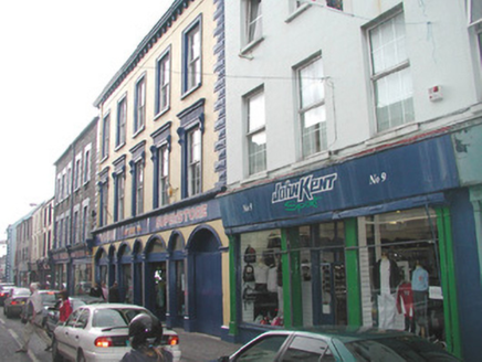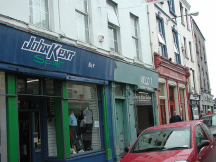 Terraced five-bay three-storey rendered house with shop, built c. 1860. Roof not visible, rendered chimneystack, cast-iron rainwater goods. Now in use as retail outlets. Painted ruled-and-lined smooth-rendered walls to upper floors. Square-headed window openings to upper floors, painted sills, uPVC casement windows c. 1990. Surviving timber shutters visible in interior. Square-headed window openings to shopfront to west consisting of plate glass display windows flanking central recessed doorway beneath painted timber sign board, c. 1980, supported by original painted timber paired slender colonnettes at east and west and fluted pilasters to either side of entrance. Shopfront to east with similar details, original painted timber four-panel door, plain-glazed overlight. Street fronted.