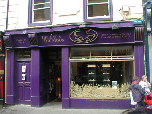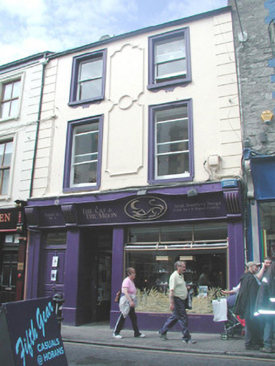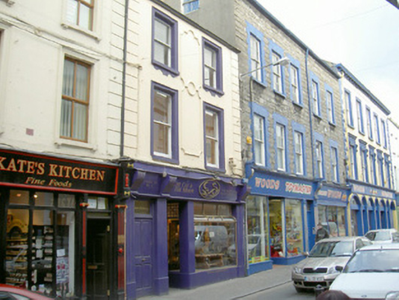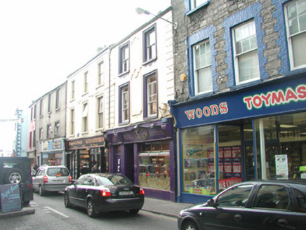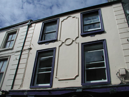 Terraced two-bay three-storey rendered house, built c. 1880, with shopfront incorporating separate entrance door to west. Pitched slate roof, rendered chimneystack, moulded metal rainwater goods. Painted smooth-rendered walls, decorative moulded panels between first and second floor windows, straight channelled quoins to upper floors. Square-headed window openings, painted moulded render surrounds, painted masonry sills with moulded enrichments below, one-over-one painted timber sash windows. Painted render pilasters with rope-moulded corners on plinth blocks separate display window, shop entrance and doorway to upper floors. Painted timber fascia board with upper moulding sweeping over raised elliptical crest terminating in fluted console brackets. Square-headed recessed entrance door opening, plain bissected overlight, painted timber panelled and glazed door. Square-headed door opening to upper floors under continuation of shopfront, plain-glazed overlight, painted timber four-panel door. Street fronted.