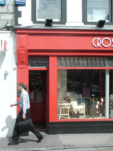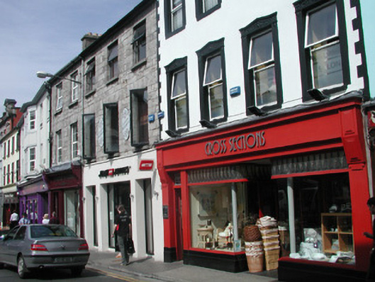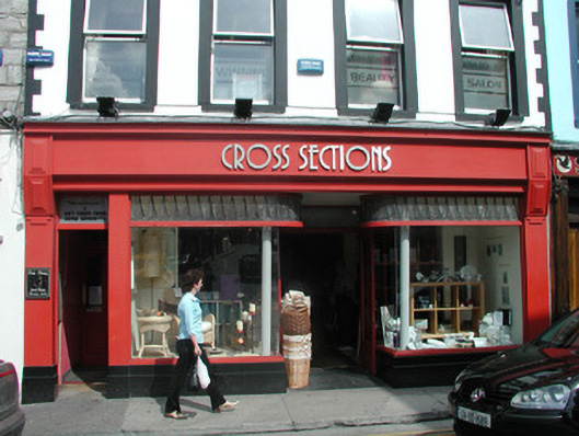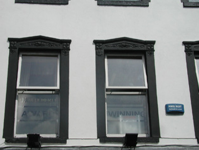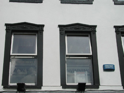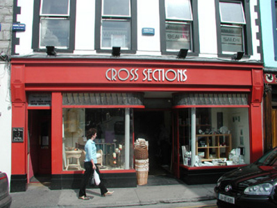 Attached four-bay three-storey smooth-rendered retail premises, built c. 1850, formerly with living accommodation above accessed by separate door to west. Roof not visible behind parapet. Painted smooth-rendered walls, painted quoins to upper floors, projecting frieze, cornice and blocking course to parapet. Square-headed window openings, painted smooth rendered surrounds, enriched pediments to first floor, painted masonry sills, painted timber casement windows c. 1990. Ground floor painted timber shopfront, flat pilasters, plain fascia sign board with raised lettering terminating in flat angular consoles, plate glass display windows on black granite plinths returning to recessed central entrance, arrow-head pattern leaded overlights returning as quadrants to entrance, painted timber glazed double doors, cast-iron columns set behind glazing carrying upper floors. Square-headed door opening to west, obscured glass overlight, painted timber panelled door leading to upper floors. Street-fronted.