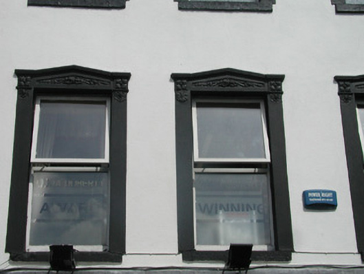 A fine example of a shop premises with separate access to floors above. The building is enlivened by its attractive render details and especially by the very fine shop front with its curving decorative overlights.