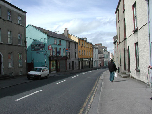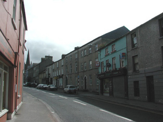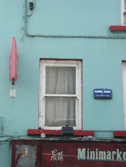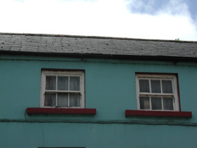 End-of-terrace four-bay three-storey smooth-rendered house and shop, built c. 1810, with single-storey flat-roofed extension to rear c. 1970 and infill timber shopfront, c. 1980. Shop now vacant. Pitched artificial slate roof, concrete verge capping to east gable, half-round cast-iron rainwater goods. Painted smooth-rendered ruled-and-lined walls. Square-headed window openings, painted stone sills, two centrally-located painted timber three-over-three sash windows to second floor, painted timber one-over-one sash windows with exposed cases to first floor. Modern painted timber infill shopfront containing glass display window to east and metal security shutter to west covering the entrance. Street fronted. Lane to east leading to rear of terrace.