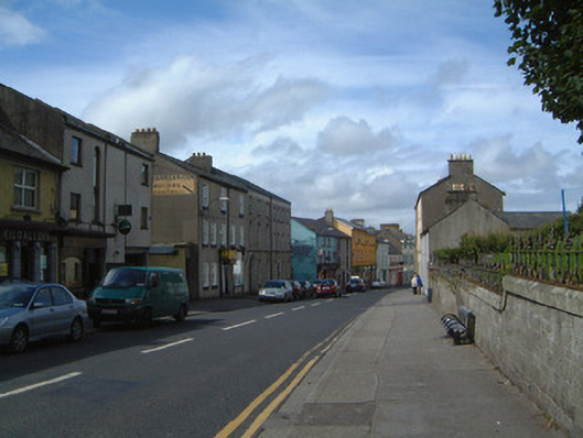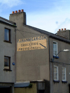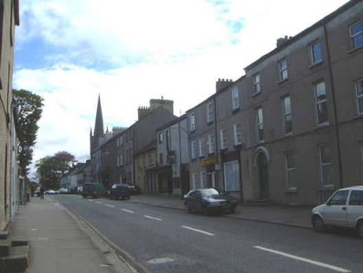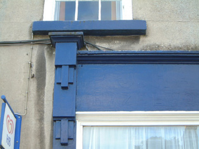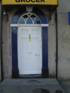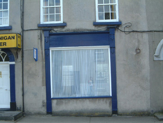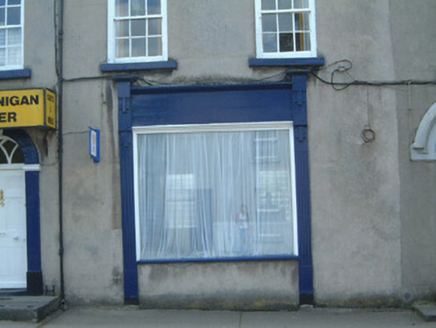 Terraced five-bay three-storey rendered house, built c. 1810, with timber shopfront c. 1920, to ground floor west, shop sign c. 1980 above central door opening, single-storey store c. 1980 to east. Shop now vacant. Pitched artificial slate roof, artificial ridge tiles, unpainted smooth-rendered chimneystacks to ends of ridge, cast-iron and uPVC rainwater goods. Unpainted smooth-rendered, ruled-and-lined walls. Square-headed window openings, painted stone sills, painted timber six-over-six sash windows, two-over-six to east and west bays second floor. Painted timber shopfront with fluted pilasters supporting blank fascia terminating in dentilled corbels, square-headed single-pane display window. Round-headed door opening, painted stone surround on plinth blocks, prominent keystone detail, intersected fanlight, limestone flagstone threshold step, painted timber seven-panel door, richly moulded, brass door furniture, cast-iron boot scraper. Street fronted.