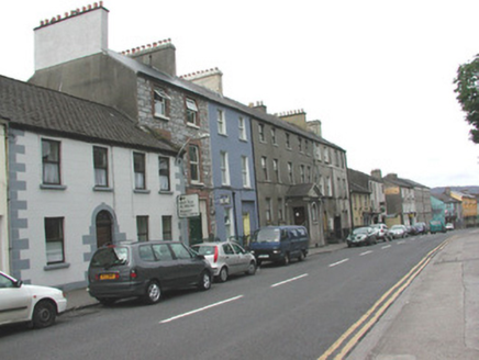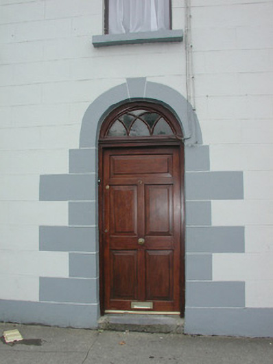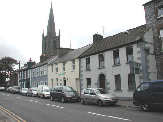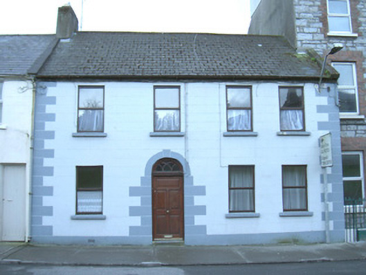 End-of-terrace four-bay two-storey rendered house, built c. 1880. Pitched artificial slate roof, unpainted smooth-rendered chimneystack, cast-iron rainwater goods. Painted smooth-rendered ruled-and-lined walls, painted quoins. Square-headed window openings, painted masonry sills, one-over-one timber casement windows c. 1995. Round-headed door opening, painted block-and-start surround, fanlight over hardwood five-panel door c. 1995. Street fronted.