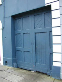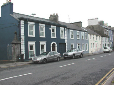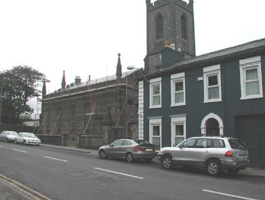 End-of-terrace four-bay two-storey rendered house, built c. 1830, with integral carriage arch at west accessing rear. Pitched slate roof set behind low parapet, clay ridge tiles, painted smooth-rendered chimneystack, cast-iron downpipe. Painted smooth-rendered ruled-and-lined walls, straight channelled quoins, blocking course with cornice, raised plinth. Square-headed window openings, painted moulded render surrounds, flat entablatures to ground floor, painted stone sills, decorative cast-iron sill guards to ground floor, uPVC casement windows c. 2000. Round-headed door opening with painted rendered surround with keystone, flanking pilasters, hardwood six-panel door c. 2000, fanlight c. 2000. Square-headed carriage arch, painted timber diagonally-sheeted double gates leading to rear yard. Street fronted with Calry Church of Ireland church to east.