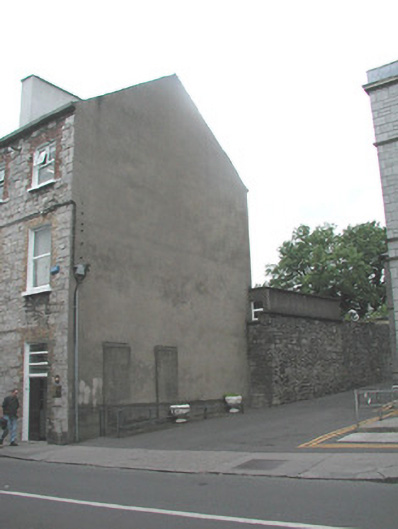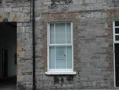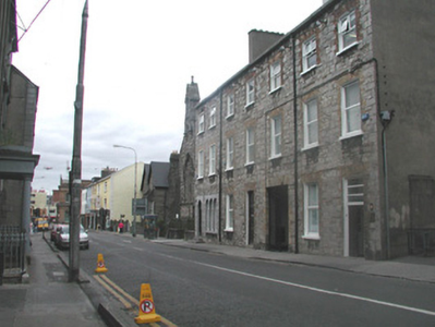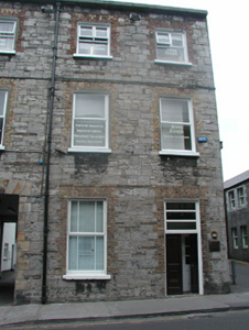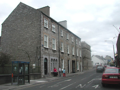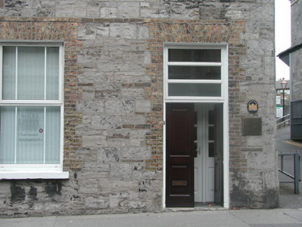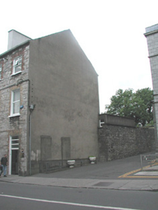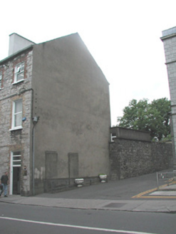 End-of-terrace two-bay three-storey stone house, built c. 1860. One of a group of three. Now in commercial use. Pitched artificial slate roof, c. 2000, smooth-rendered chimneystack, square profile gutters, cast-iron downpipe. Exposed squared limestone walls to front elevation, smooth-rendered gable to east. Square-headed window openings, brick dressings, painted reveals, painted stone sills, one-over-one painted timber casement windows c. 2000. Square-headed door opening to east, three horzontal pane overlight, harwood panelled double door c. 2000. Street fronted, single-storey flat-roofed extension to rear c. 1970, rubble stone wall to boundary at alleyway to east.