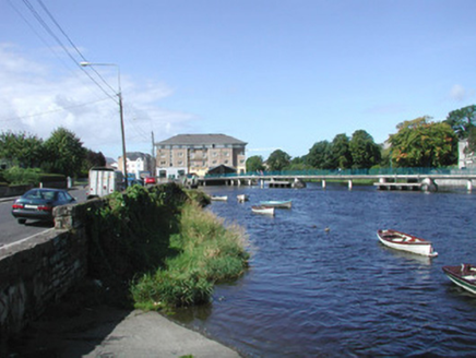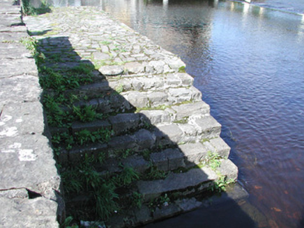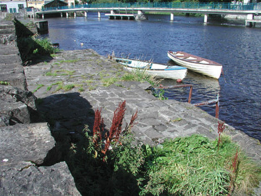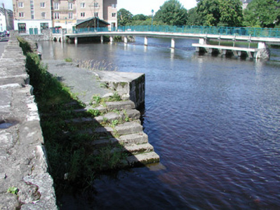 Three stone mooring jetties projecting from promenade wall, equally spaced, built c. 1880. East and west jetties rectangular on plan, central jetty with triangular protrusion to north containing concrete sewer outfall. Rubble limestone stone walls, irregular limestone paving, roughly-dressed limestone steps at upstream and downstream ends. Located on south bank of Garavogue River, rubble limestone walls to roadside between openings.