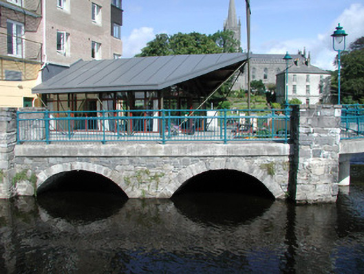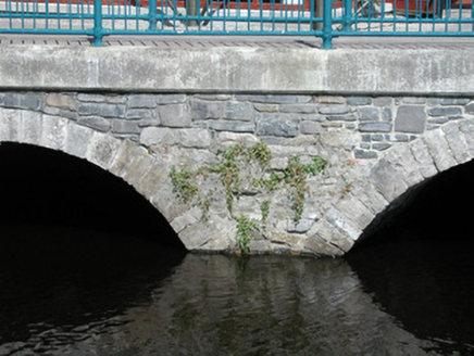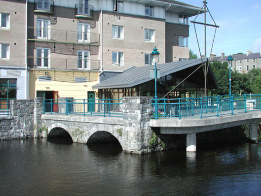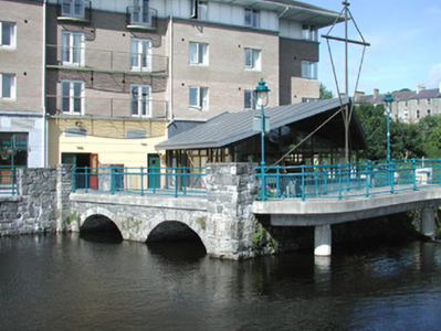 Double-span stone former mill race, built c. 1870, extensively modified and incorporated as feature in hotel development c. 2000. Rubble stone walling to spandrel, segmental arches with tooled voussoirs, insitu concrete perimeter beam, concrete pavior walkway, painted tubular steel balustrade. Located on south bank of Garavogue River giving onto footbridge following line of salmon weir.