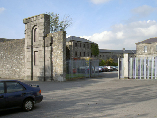 Remains of detached three-bay two-storey pedimented guard house, built 1815-8, on a symmetrical plan. Demolished, 1981. Margined limestone ashlar wall on margined limestone ashlar chamfered plinth with cut-limestone stringcourse on blind frieze. Square-headed (ground floor) or round-headed (first floor) blind openings in round-headed recess with margined rusticated limestone ashlar piers centred on margined rusticated cut-limestone keystone. Road fronted at entrance to grounds of Sligo County Gaol.