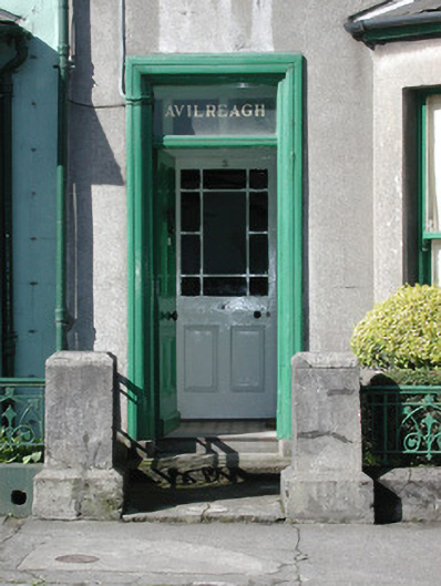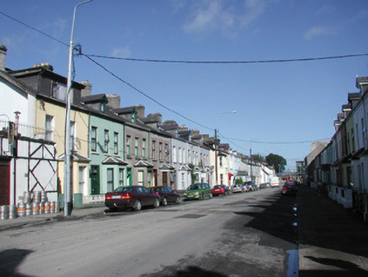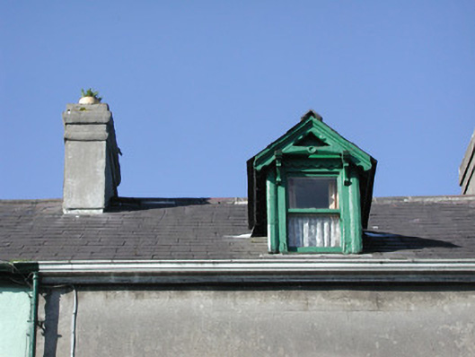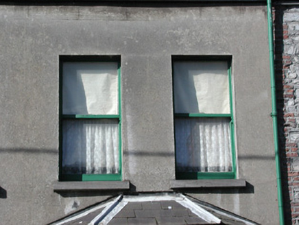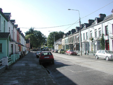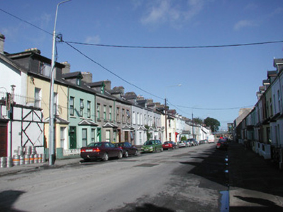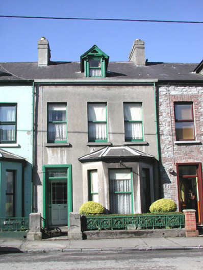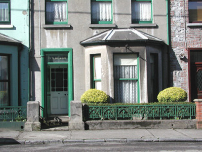 Terraced three-bay two-storey rendered house, built c. 1890, with gable-fronted dormered attic. One of a group of seven. Single-storey canted bay window to north end of east elevation. Pitched slate roofs, unpainted smooth-rendered chimneystack with clay pots, clay ridge tiles, painted timber decorative barges to dormer, extruded aluminium profiled gutters on eaves corbel course, cast-iron downpipe, half-round cast-iron gutters to bay, wood-cored lead hip cappings to bay roof. Unpainted smooth-rendered ruled-and-lined walling. Square-headed window openings, limestone sills, painted one-over-one timber sash windows. Square-headed door opening, moulded architrave, painted timber six-panel door, plain-glazed overlight with applied lettering, single stone step. Set back from street, small garden area, decorative cast-iron panelled railings on unpainted smooth-rendered plinth, smooth-rendered gate pillars.