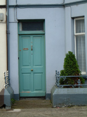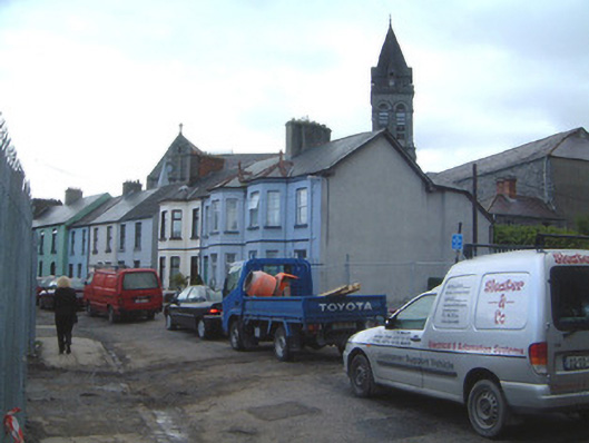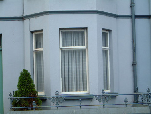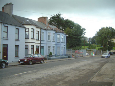 Terraced two-bay two-storey rendered house, built c. 1910. Two-storey canted bay window to west side front (north) elevation, one-and-a-half storey return building. One of a group of three. Pitched artificial slate roof, hipped to bay, clay ridge and hip tiles, clay finial to bay, red brick corbelled chimneystack, moulded cast-iron gutters on moulded eaves course, cast-iron downpipes. Painted smooth-rendered walling, moulded render string course between first and second floor. Square-headed window openings, painted stone sills, painted timber casements c. 1990. Square-headed door opening, plain-glazed overlight, painted timber four-panel door. Set back slightly from street, decorative cast-iron railings on painted smooth-rendered plinth wall with canted coping.