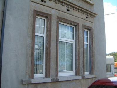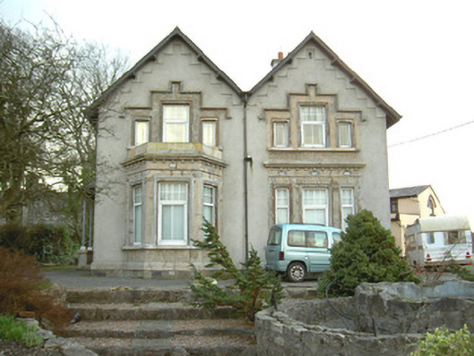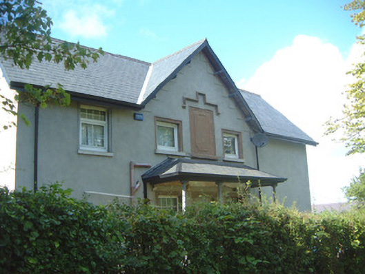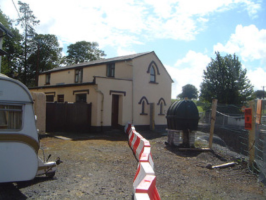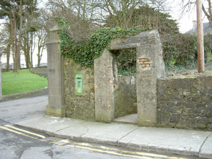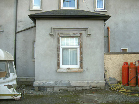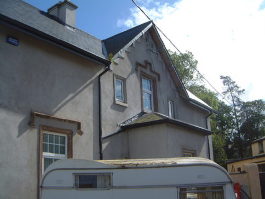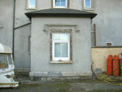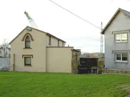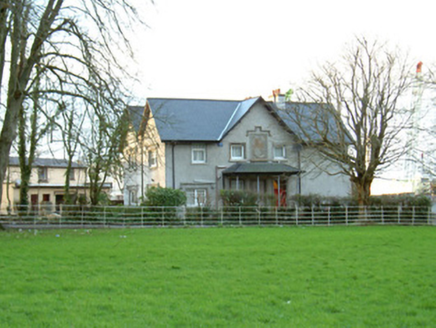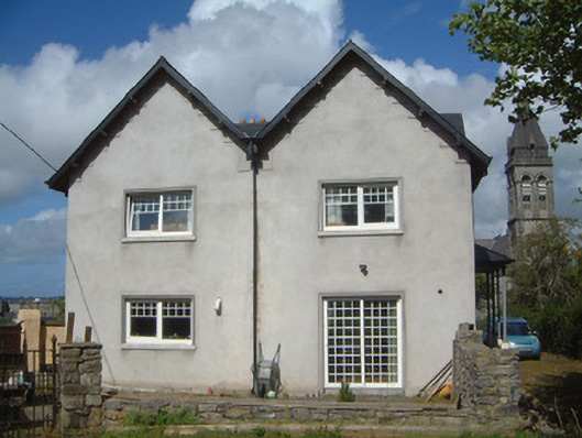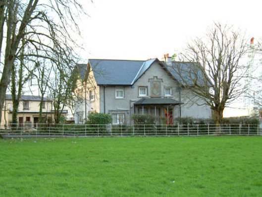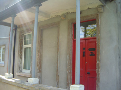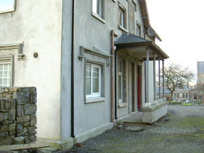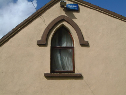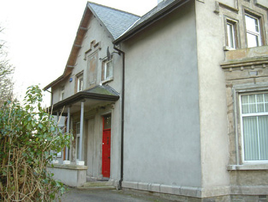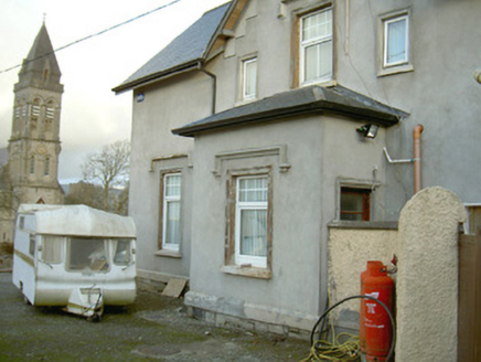Detached two-bay two-storey rendered Presbyterian manse, built c. 1890. Gable-fronted double-pile, gabled dormers to east and west elevations, projecting single-storey entrance porch with cast-iron columns to east elevation, single-storey canted bay windows to north elevation, single-storey hipped roof projection to west. Pitched artificial slate roof, 'M' profile to main roof, gable-fronted dormers to east and west, unpainted smooth-rendered chimneystack, painted timber projecting barges on purlin ends, moulded uPVC gutters, square uPVC downpipes. Unpainted smooth-rendered walling c. 2001, stepped string moulding below barge soffits, moulded render panel to central bay of first floor east elevation, corbelled cornice and blocking course to north bay. Square-headed window openings, moulded render surrounds, stepped hood moulds, stone sills, uPVC casements c. 1990. Square-headed door opening, possibly originally one of three, set in entrance porch, simple moulded render surround, plain-glazed overlight, painted timber double doors each with two panels. Set back from road in extensive grounds to north and south. Three-bay two-storey building to south-west c.1910, possibly originally church hall now in use as office space. Rubble stone boundary retaining wall to north, wrought-iron pedestrian gate in stone archway.