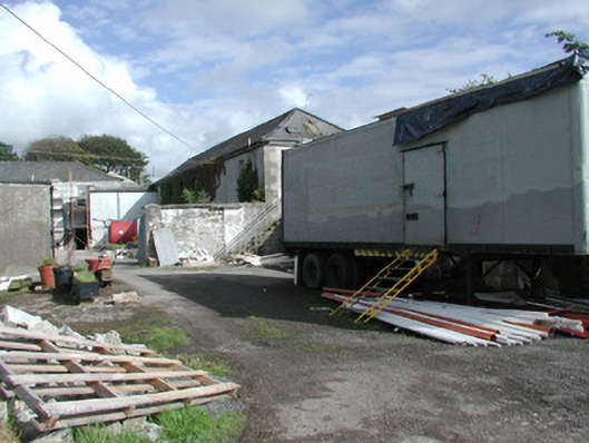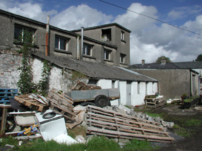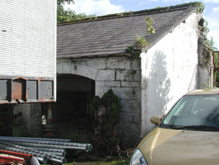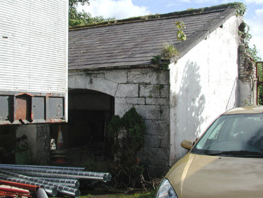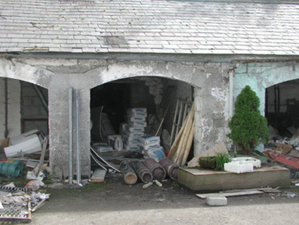 Attached six-arch single-storey stone former coach house, built c. 1810, now vacant. Single-pitch slate roof, half-round cast-iron gutters, cast-iron downpipes. Painted tooled limestone walling between piers. Segmental-headed carriage arches to north elevation, south elevation on line of rubble stone farm yard boundary wall.