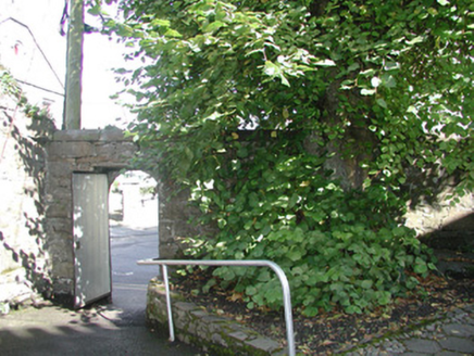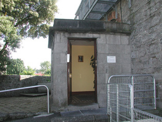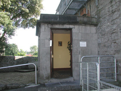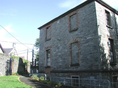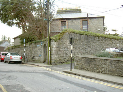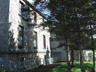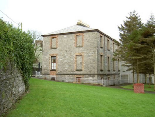 Detached four-bay by two-bay two-storey over basement stone former house, built c. 1840. Square single-storey flat-roofed porch projects from east front, two-storey smooth-rendered extension c. 1990 to south-west. Now in use as public service facility. Hipped artificial slate roof, clay ridge tiles, unpainted smooth-rendered longitudinal chimneystack with yellow clay pots, extruded aluminium rainwater goods, painted timber fascia on projecting eaves corbel course. Squared rubble limestone walling; ashlar limestone porch with recessed front panel, moulded cornice and blocking course; galvanised steel fire escape balcony to first floor front c. 1990. Square-headed window openings, brick dressings, unpainted smooth-rendered reveals, limestone sills, multi-pane hardwood casement windows c. 1990. Square-headed door opening to north side of porch, hardwood four-panel door c1990. Basement area bounded by tubular steel fence c, 2000. Located at north-east corner of landscaped grounds, accessed by painted timber vertically-sheeted door set in round-headed arched opening in north-east corner, rubble stone boundary wall with stone saddle-back coping.