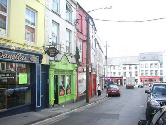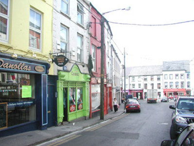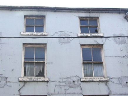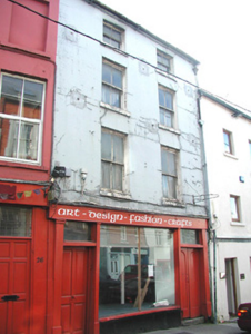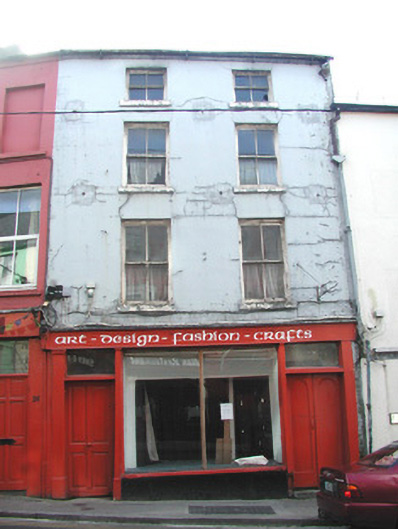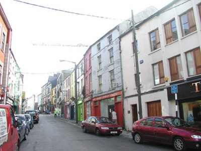 Terraced two-bay four-storey rendered house, built c. 1860. Shop front c. 1920. Pitched slate roof, cast-iron rainwater goods, corbelled eaves course. Painted smooth-rendered ruled-and-lined walling. Square-headed window openings to upper floors, painted stone sills, painted two-over-two timber sash windows. Shopfront with central vertically sub-divided display window on painted smooth-rendered stall riser, painted timber double doors to north each with single round-headed panel, painted timber four-panel door to south, plain-glazed fanlights over doors, plain painted timber pilasters flanking both doorcases, narrow full-width painted timber sign fascia. Street fronted on hill, lower buildings to north. Set on one of Sligo town's busiest streets with pavement to immediate front. Shop is currently undergoing renovations and is not in use.